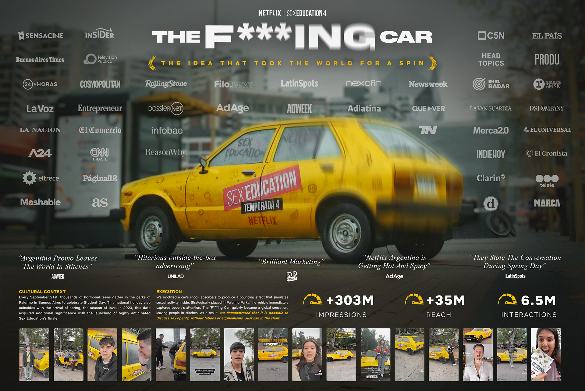 The season premiere coincided with Student’s Day in Argentina, meaning that thousands of teens, and their hormones, would gather up at the famous Bosques de Palermo. We simply modify the shock absorbers of a branded car, making it bounce continuously and give the impression of sexual activity inside, thus creating something truly unique.